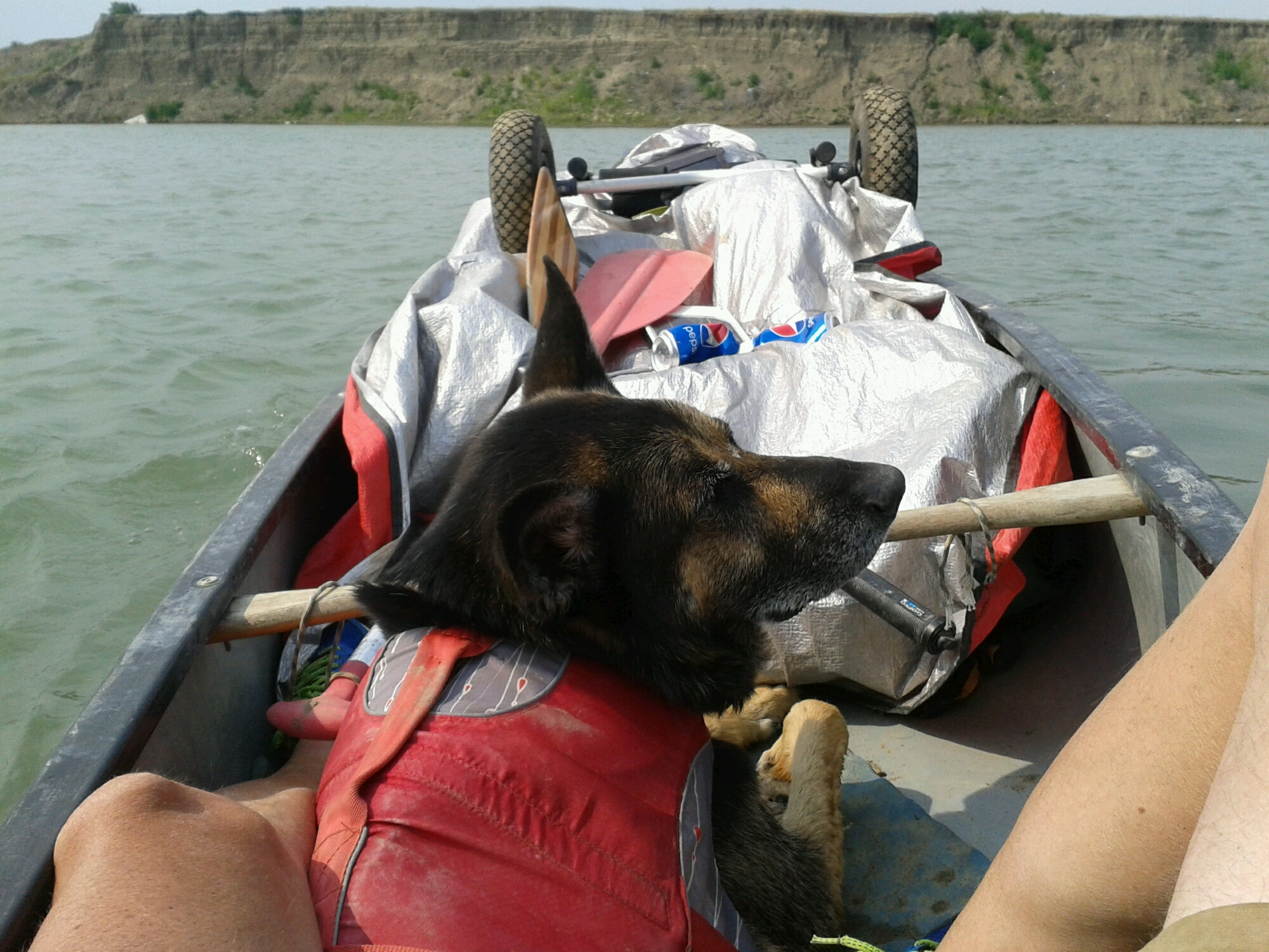 He is an important part of this human-dog team. He has been vital in his role. When going up river, stuck on large sandbars and hauling the canoe distances overland to the river he has been incredible. I hook his leash to my belt, I grab the canoe or it’s ropes and yell “Go! ” He is a powerful one hundred pound German Shepherd and pulls me easily as we both pull the canoe and gear.