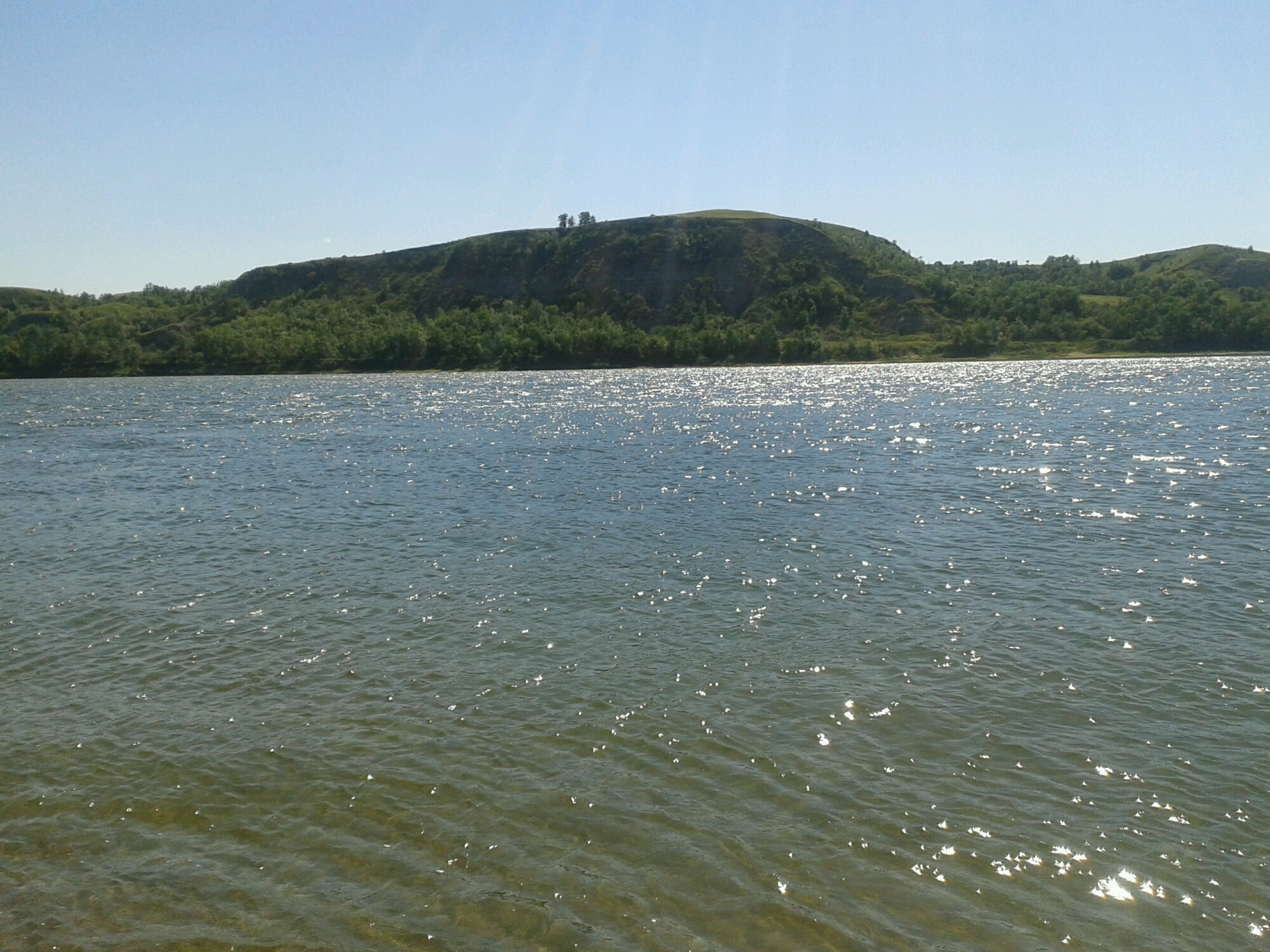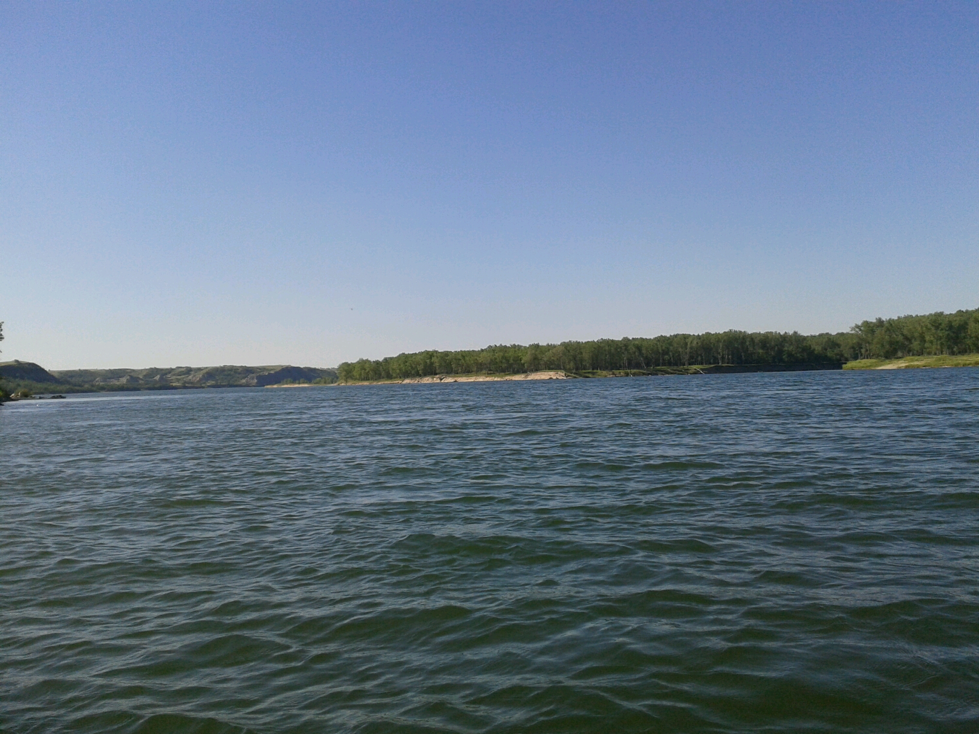 Crossing the river near the spillway of Garrison dam. Wind not being polite. It made me do it. River very wide at this point.